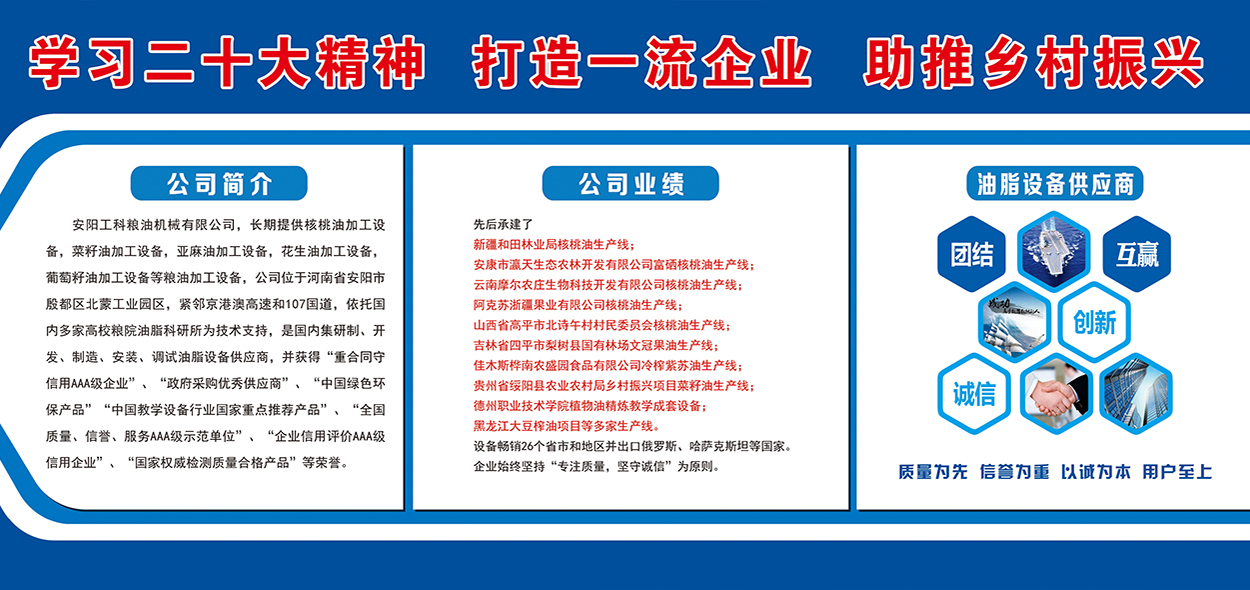 安陽工科糧油機(jī)械有限公司,長期提供核桃油加工設(shè)備,茶籽油加工設(shè)備,菜籽油加工設(shè)備,亞麻油加工設(shè)備,花生油加工設(shè)備,葡萄籽油加工設(shè)備等糧油加工設(shè)備,公司位于河南省安陽市殷都區(qū)北蒙工業(yè)園區(qū),緊鄰京港澳高速和107國道,依托國內(nèi)多家高校糧院油脂科研所為技術(shù)支持,是國內(nèi)集研制、開發(fā)、制造、安裝、調(diào)試油脂設(shè)備供應(yīng)商,并獲得“重合同守信用AAA級企業(yè)”、“政府采購優(yōu)秀供應(yīng)商”、“中國綠色環(huán)保產(chǎn)品”“中國教學(xué)設(shè)備行業(yè)國家重點(diǎn)推薦產(chǎn)品”、“全國質(zhì)量、信譽(yù)、服務(wù)AAA級示范單位”、“企業(yè)信用評價AAA級信用企業(yè)”、“國家權(quán)威檢測質(zhì)量合格產(chǎn)品”等榮譽(yù)。先后承建了新疆和田林業(yè)...